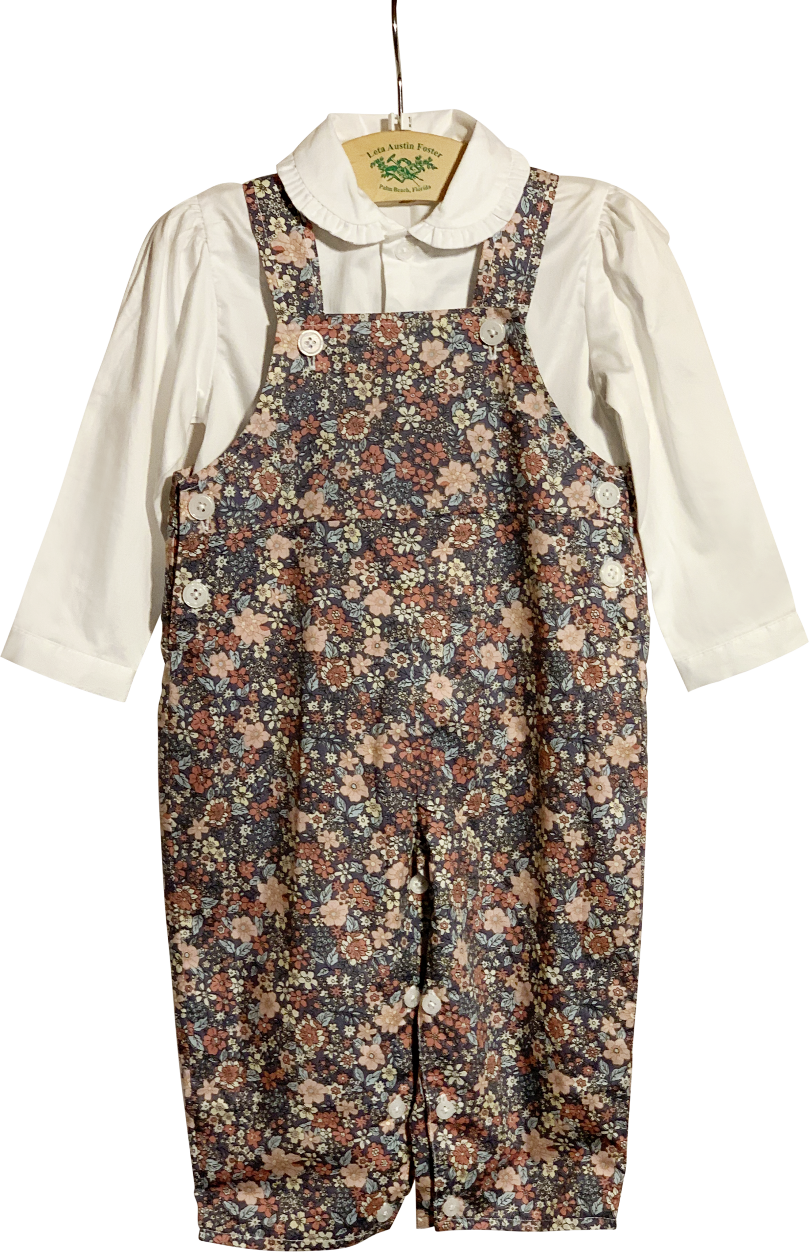 Floral overalls with with ivory blouse.