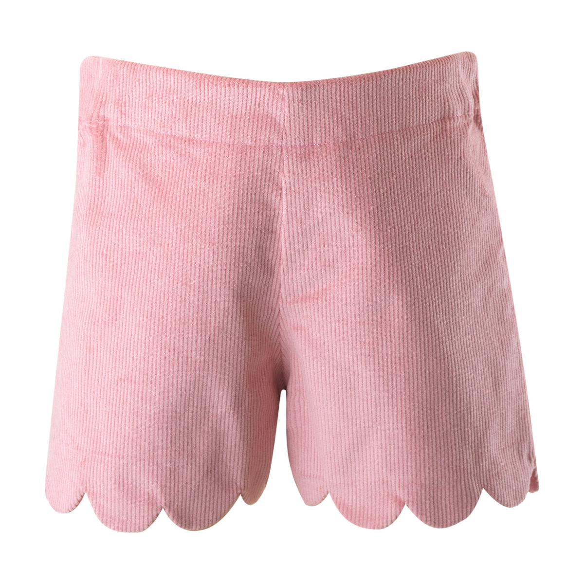 Pink corduroy shorts with elastic waist and scalloped edge detail.