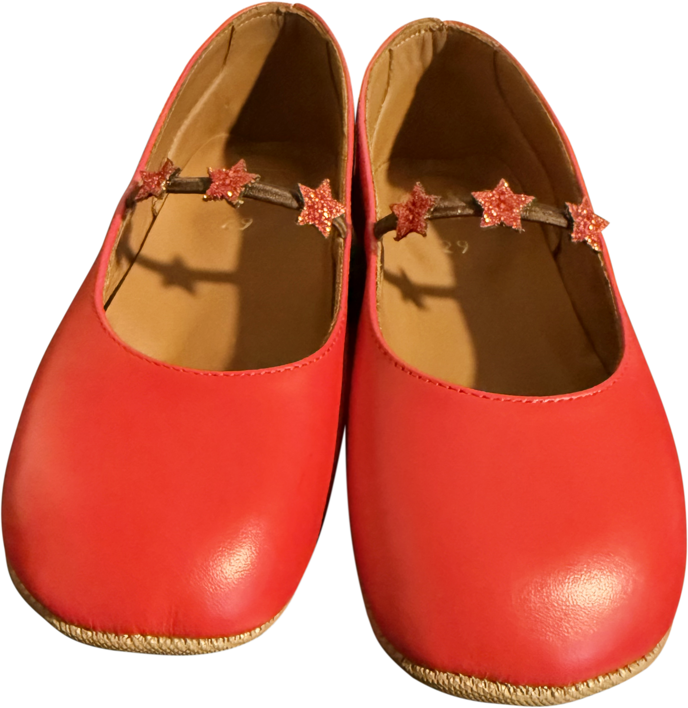 Soft leather girl’s shoe in red with three stars sewn onto elastic band. Made in Italy.
