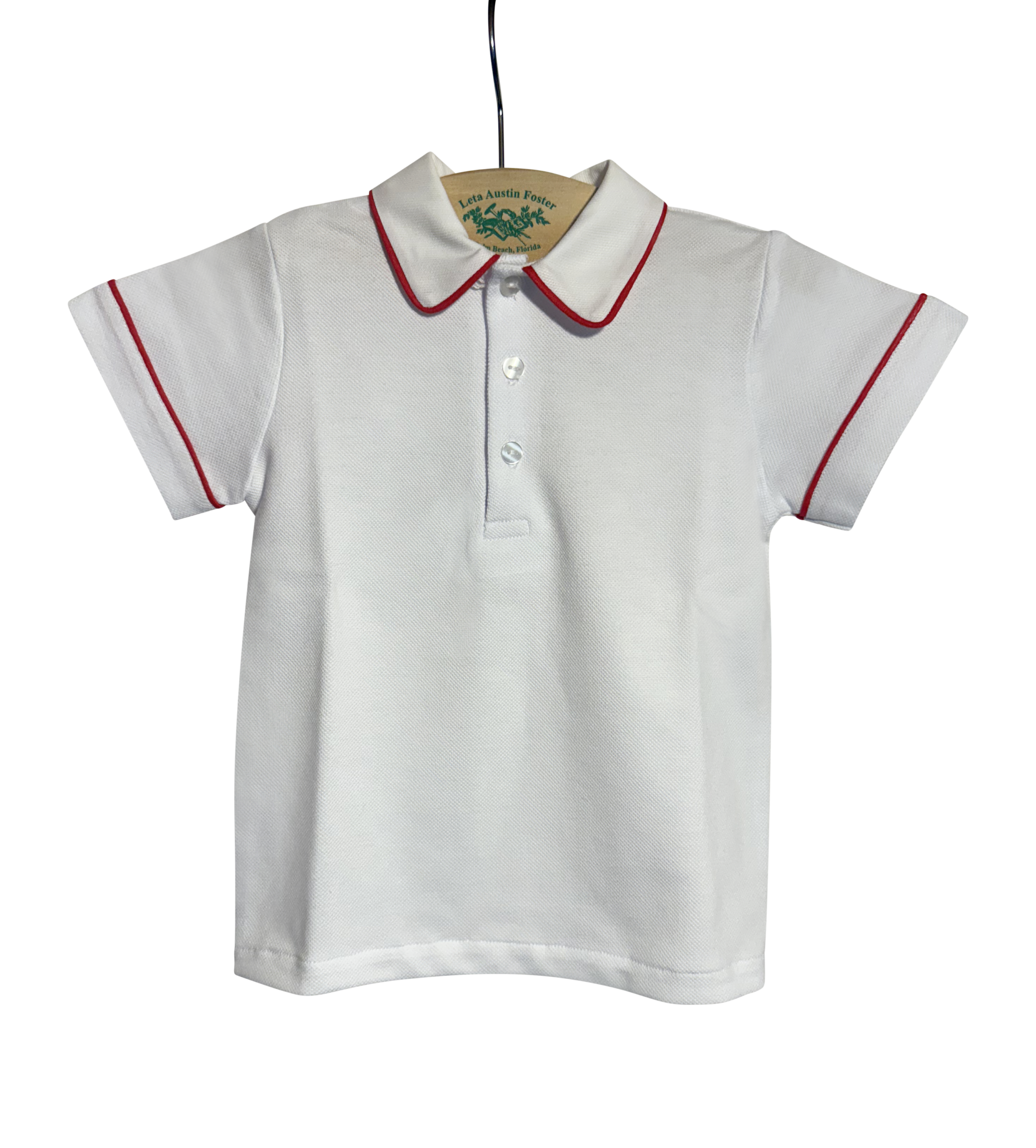White polo shirt with straight colar. Red piping on collar and sleves. Made in Italy.