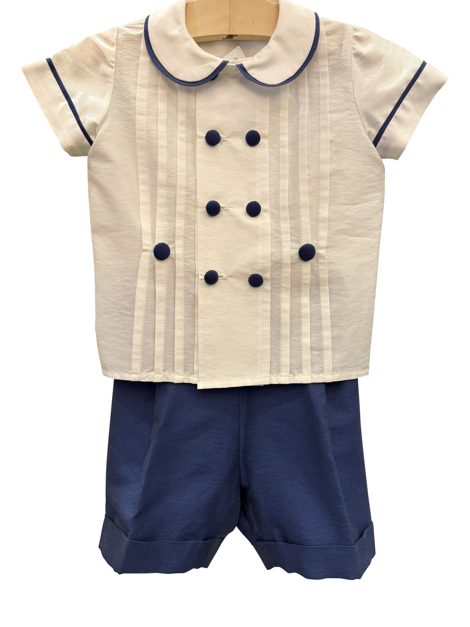 Blue silk shorts with white button shirt with blue details and buttons designed by Leta Austin Foster. This item can be made custom in a range of colours. Leadtime is 6 weeks. Made in Italy.
