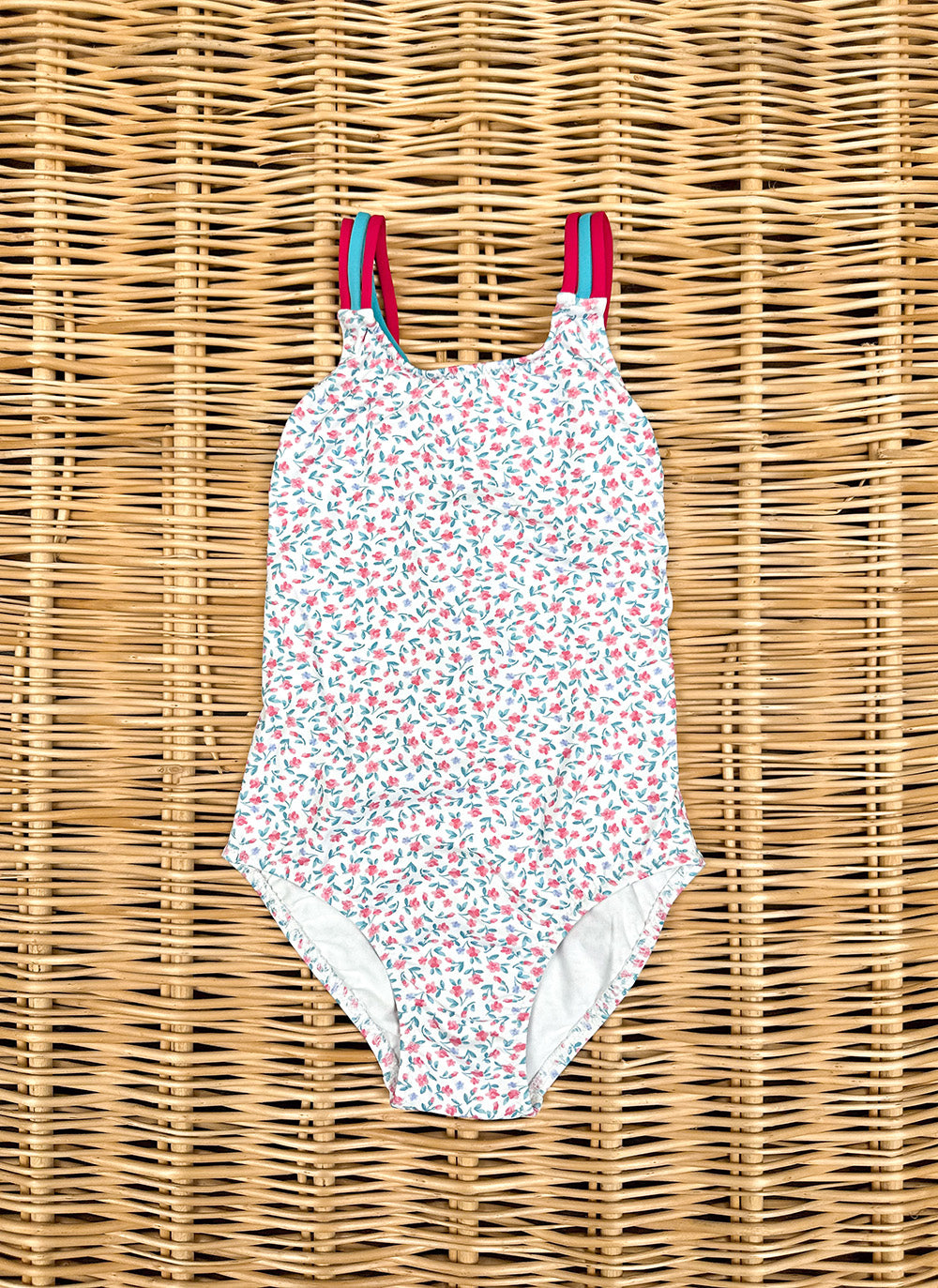 White swimsuit with flower print. Pink and teal back straps. Made in Italy.