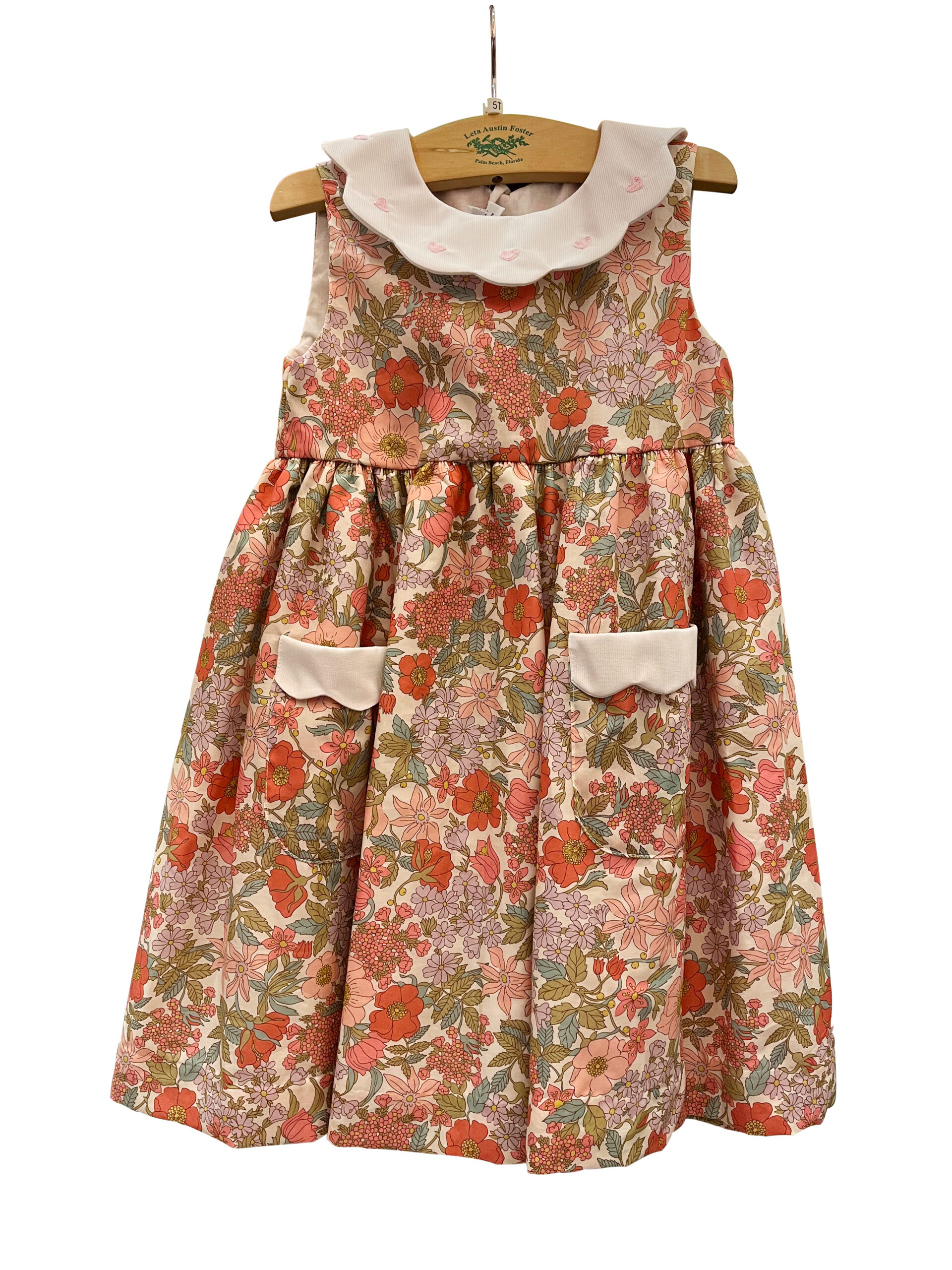 Dress in pink Liberty fabric, with white scalloped collar and pink heart embroidery designed by Leta Austin Foster. This item can be custom ordered in range of patterns. Leadtime is 6 weeks. Made in Italy.