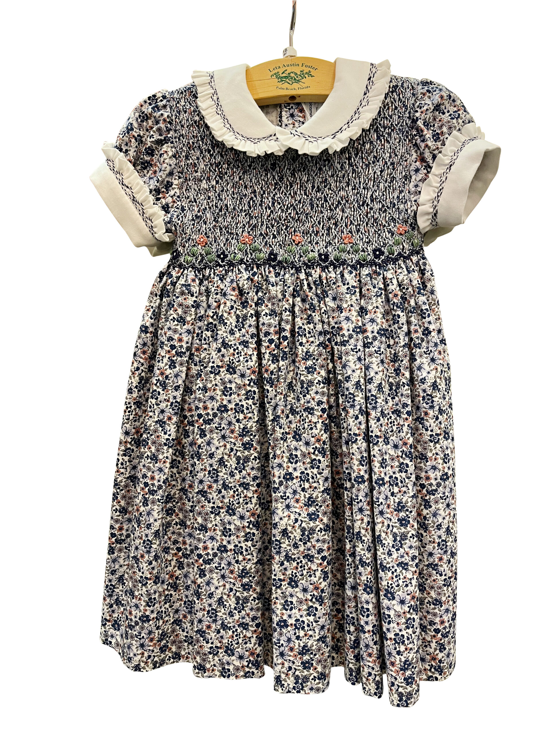 Baroni Smocked Celebration Dress in Navy Floral Print with Rose Embroidery