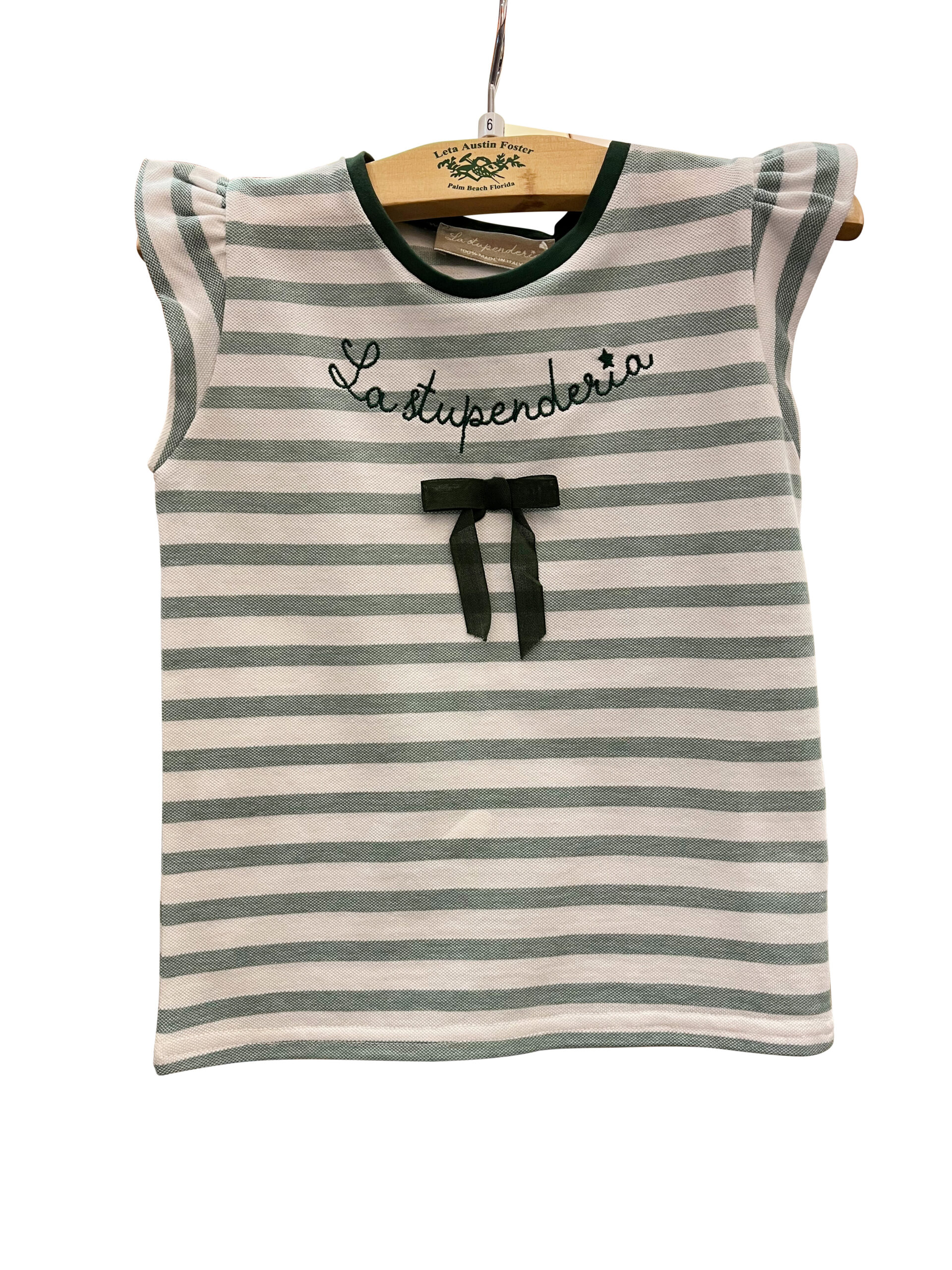 Sleveless shirt with green and white stripes. It says La Stupenderia on the front. Made in Italy.
