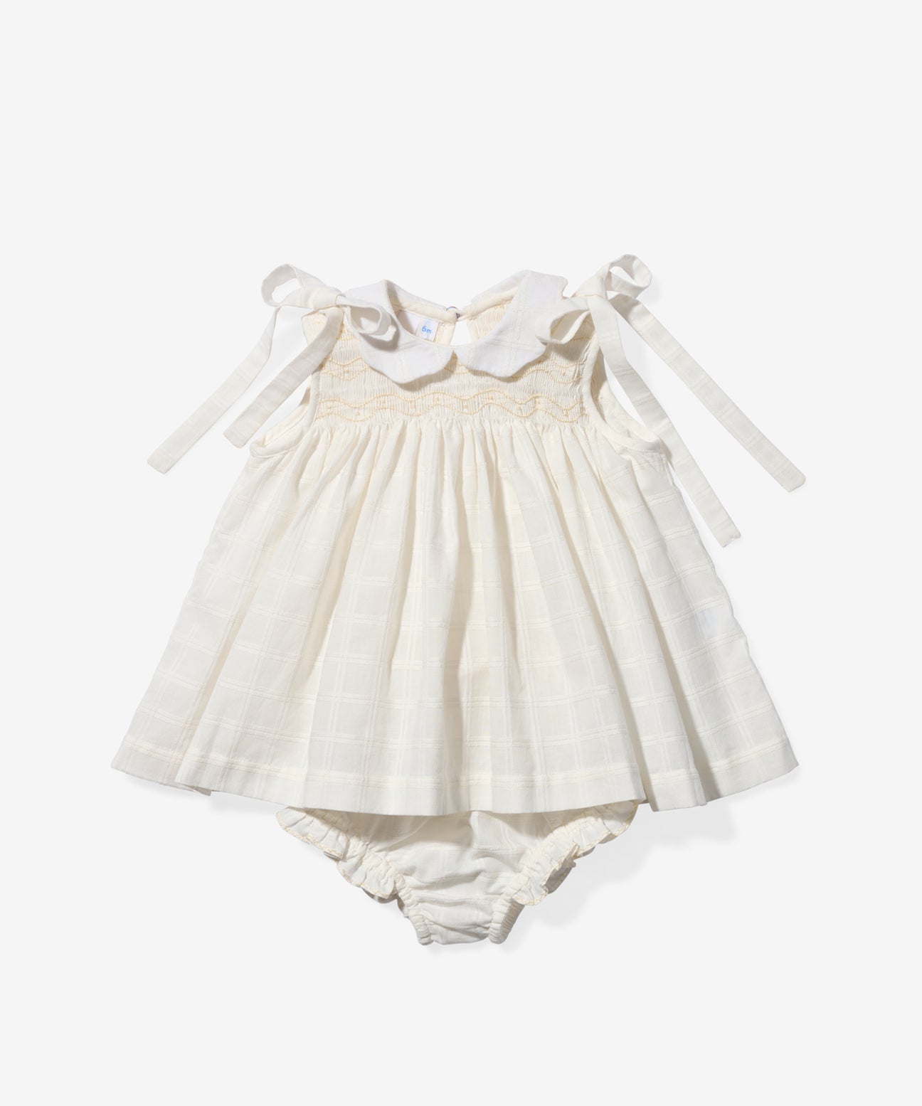 White organic cotton dress with hand embroidery and scalloped collar. Made in USA.