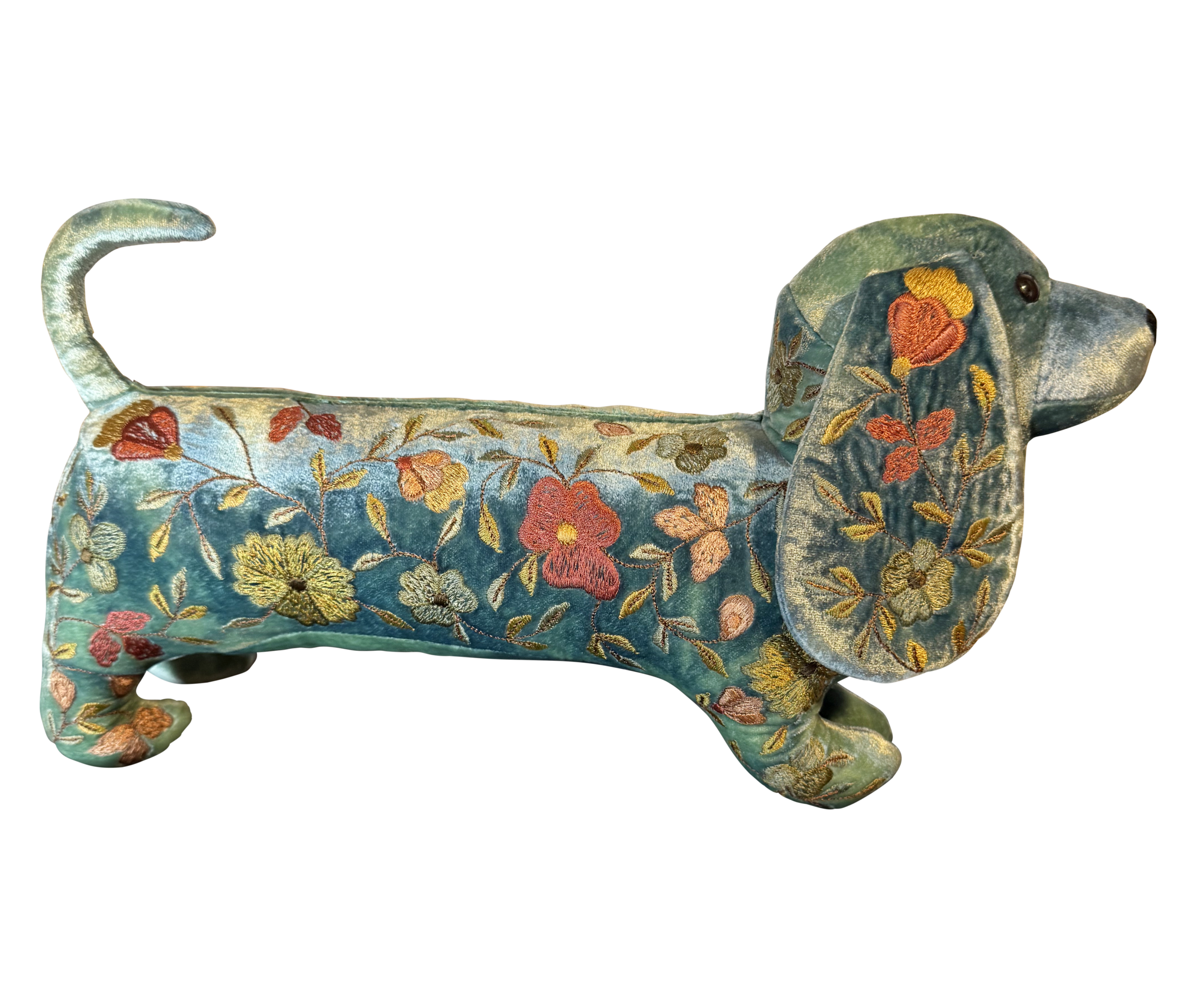 Hand embroidered soft dachshund made in lagoon silk velvet.