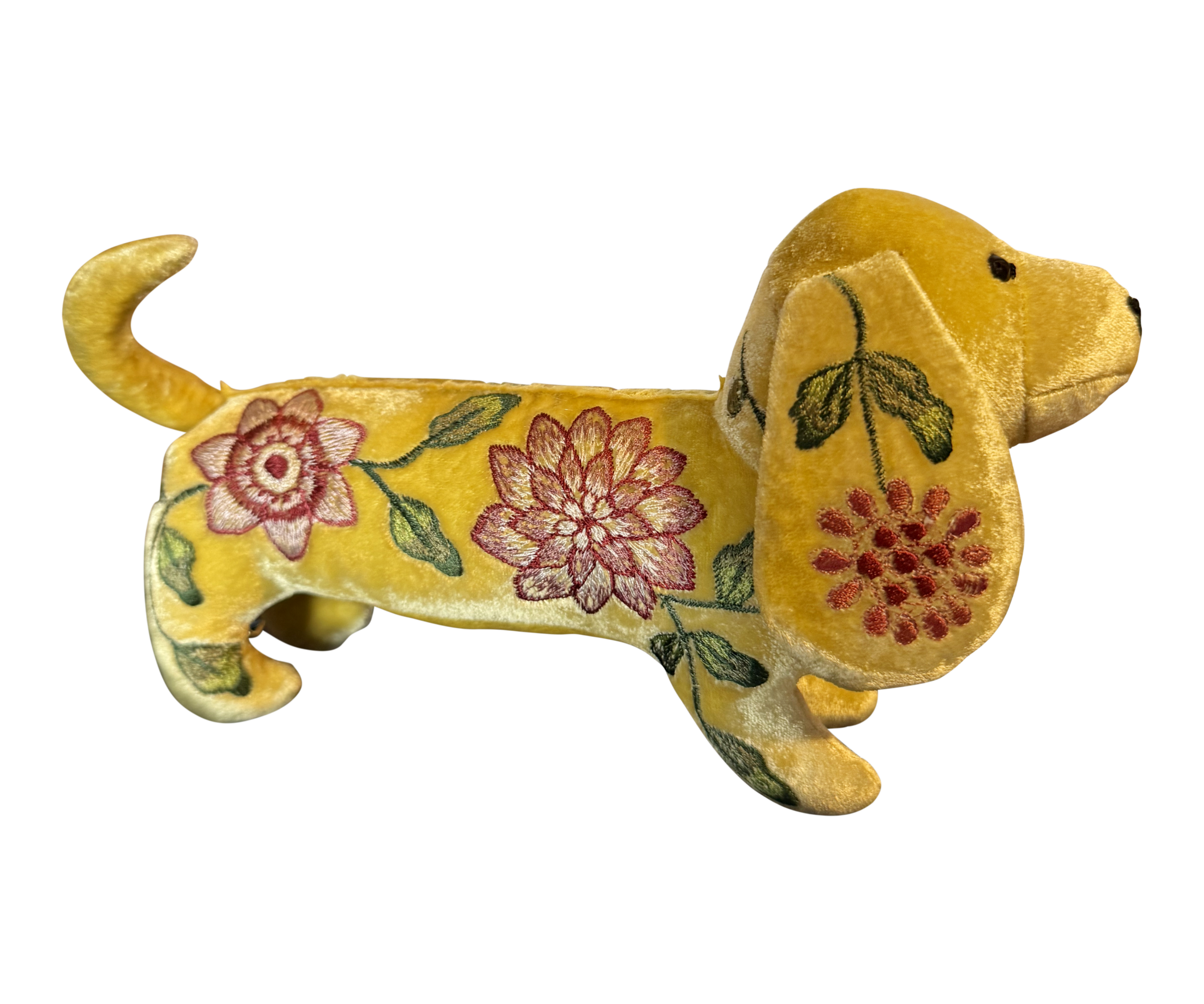 Hand embroidered soft mini dachshund made in citrine silk velvet.
