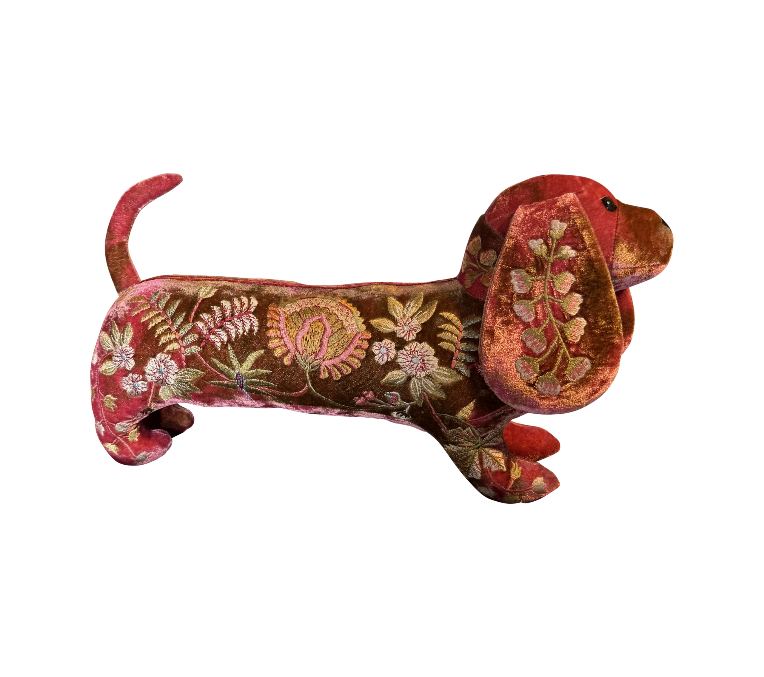 Hand embroidered soft dachshund made in soft pink silk velvet.