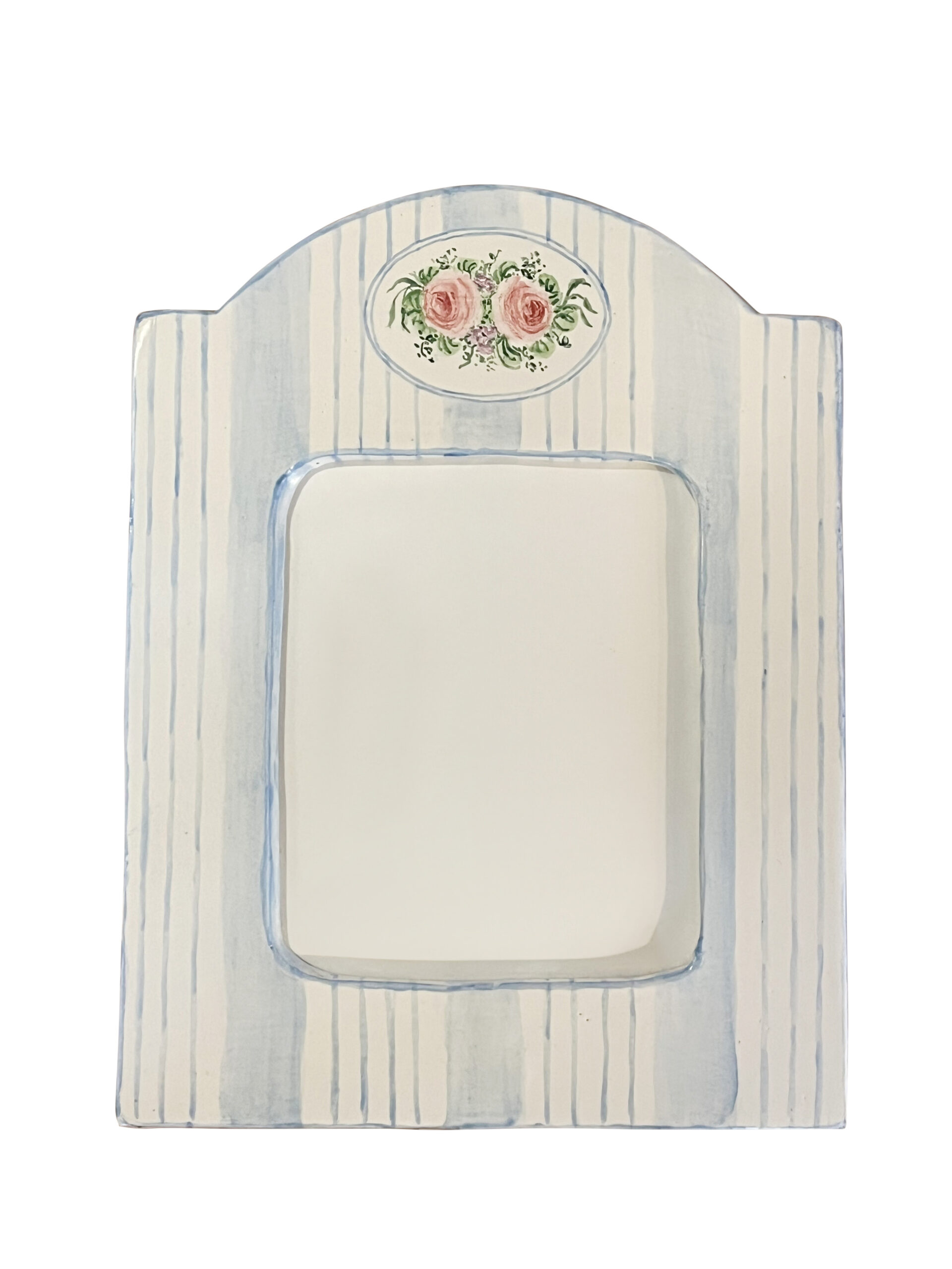 Large blue-striped picture frame with a floral design featuring pink roses at the top.