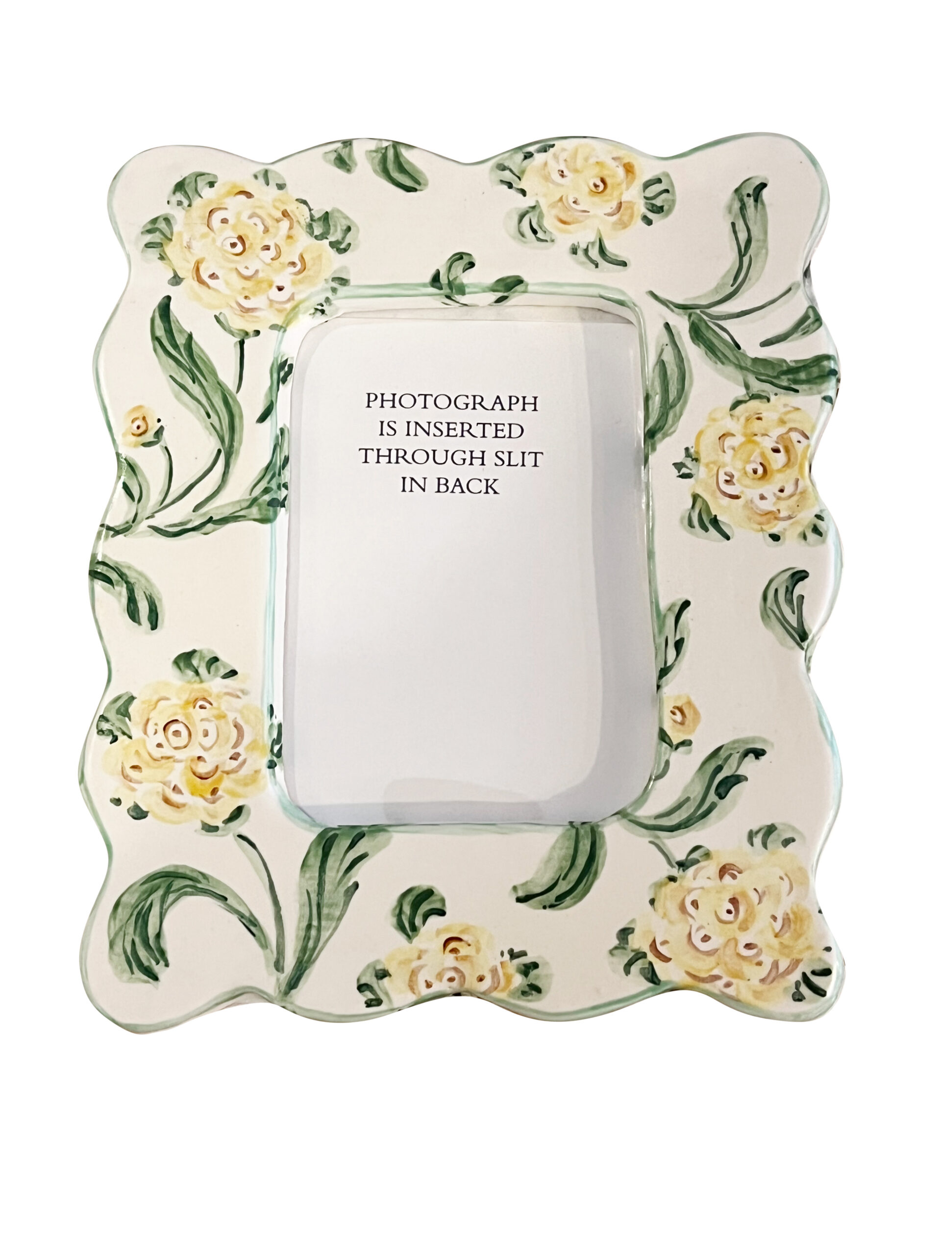 Decorative medium picture frame with yellow flowers and green leaves, featuring a back slit for photo insertion.