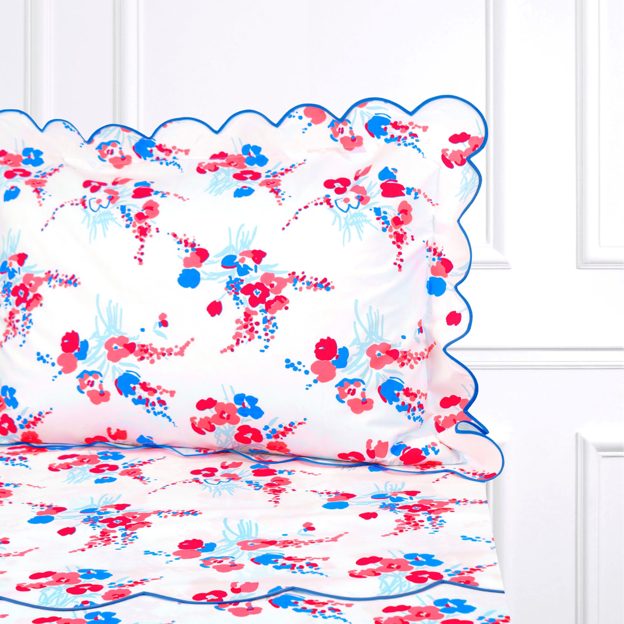 D. Porthault Queen Set of Sheets in Demoiselles Red and Blue