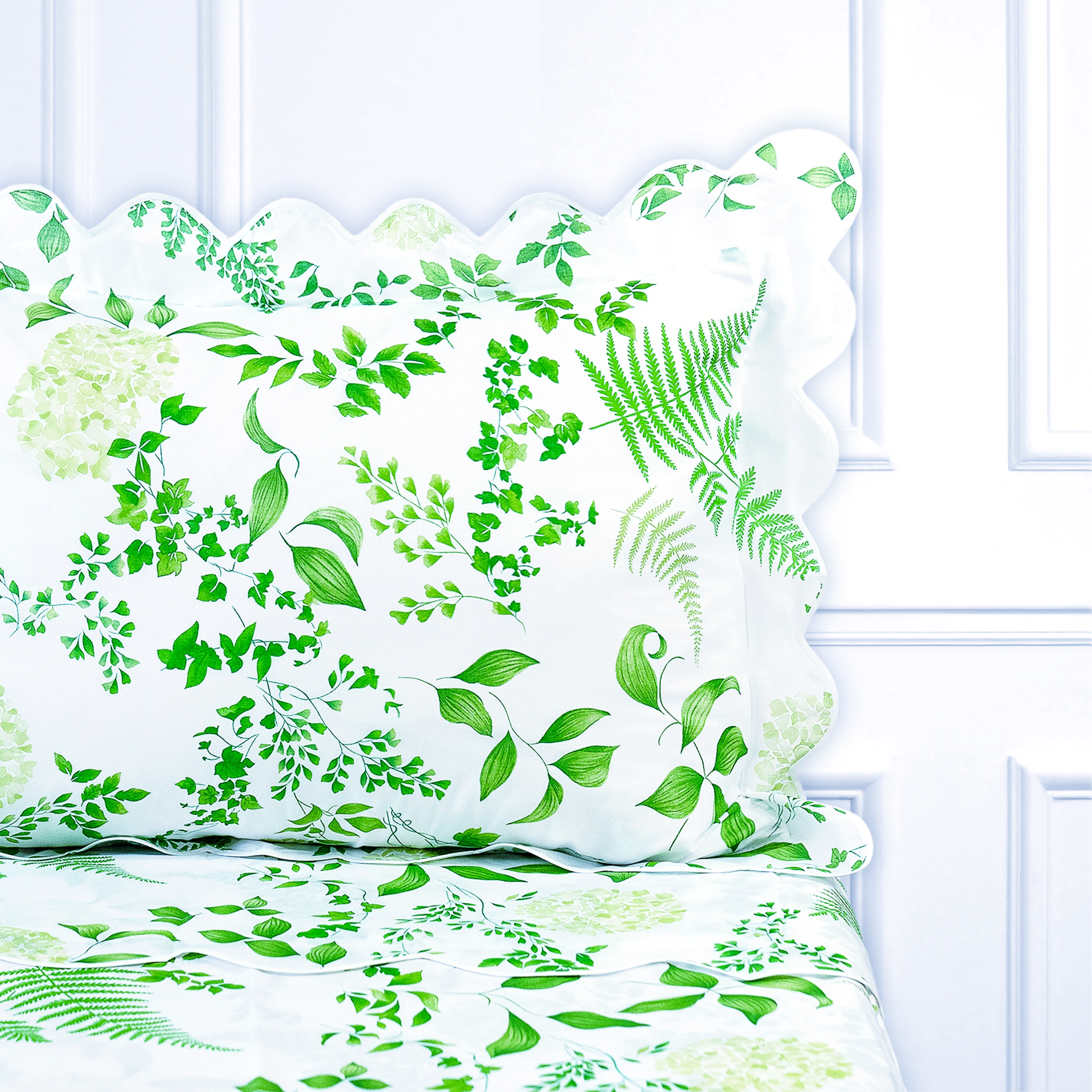 D. Porthault Queen (102″ x 126″) set of sheets includes top sheet, bottom (flat) sheet, 2 standard shams (20″ x 27″). Made in France.