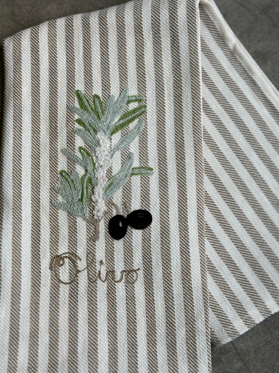 Embroiderd olive branch on grey and white stripe kitchen towel. Size: 22.83″ x 27.56″ Materials: 60% linen 40% cotton. Made in Italy.