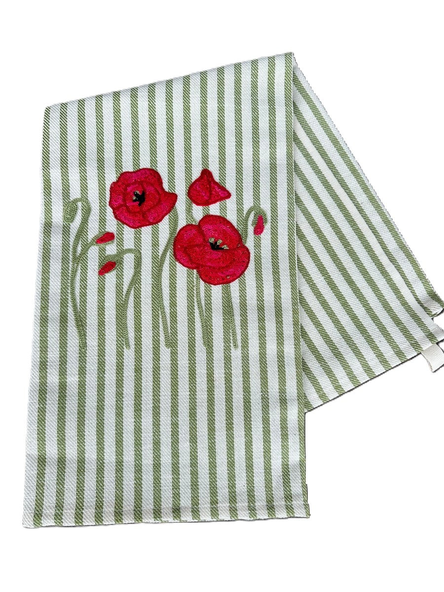 Embroidered poppies on green and white stripe kitchen towel. Size: 22.83″ x 27.56″ Materials: 60% linen 40% cotton. Made in Italy.