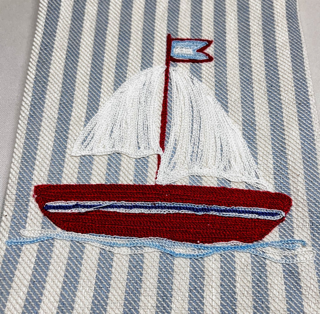 Embroiderd sailboat on blue and white kitchen towel. Size: 22.83″ x 27.56″ Materials: 60% linen 40% cotton. Made in Italy.