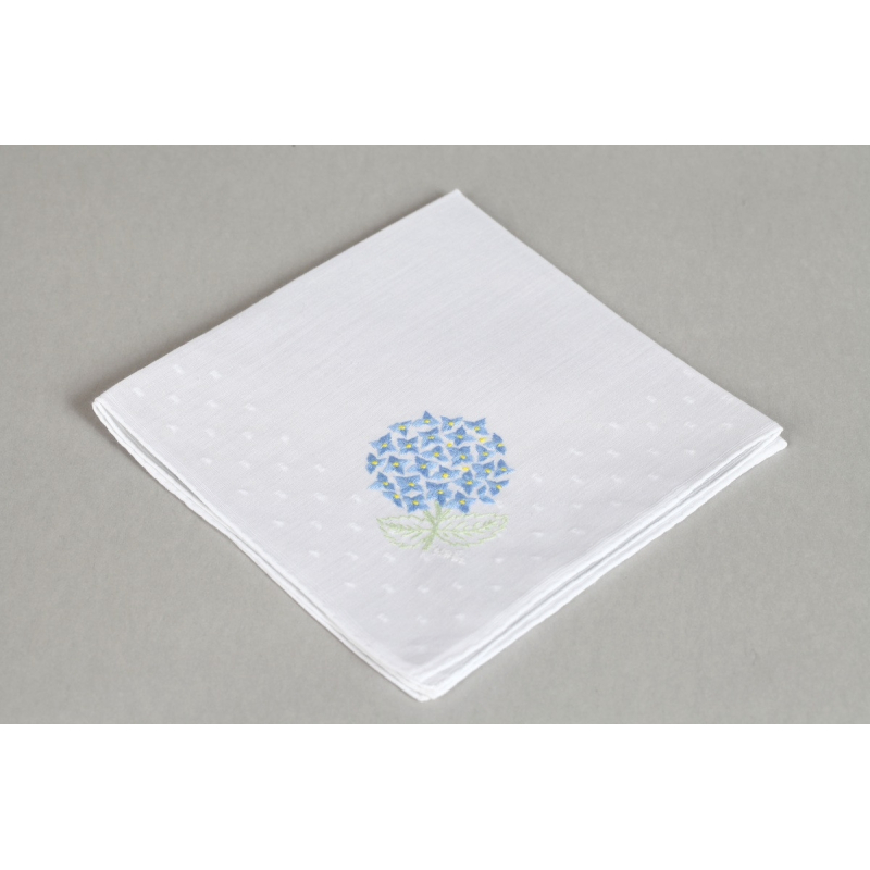 White cotton handkerchief with hortensia blossom embroidered on corner. Made in France.