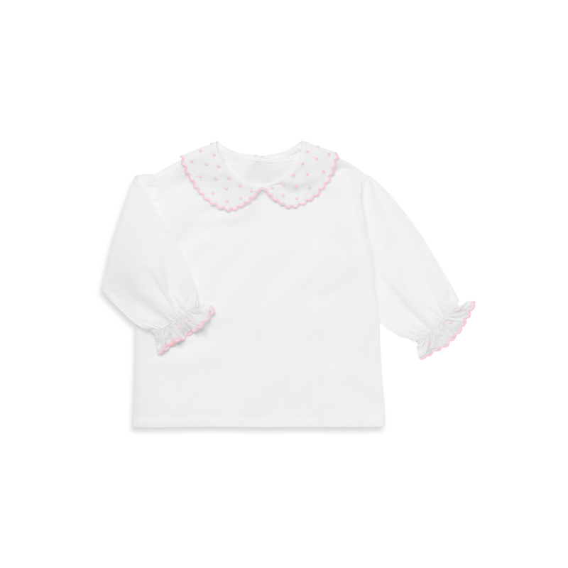 Cotton voile shirt scalloped edge in white with pink embroidery. Made in France.