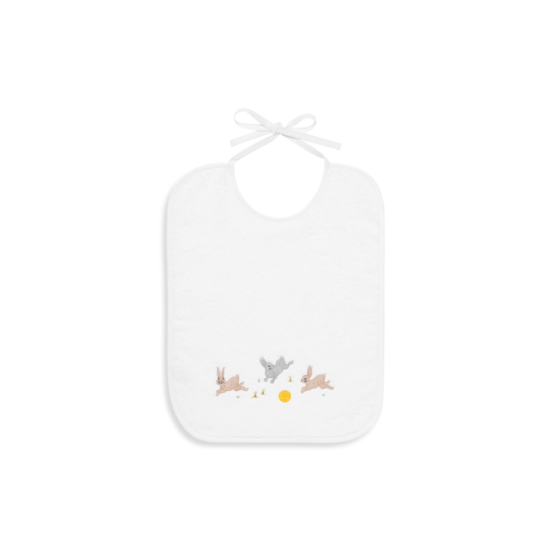 Terrycloth bib with rabbits embroidered on front. Made in France.