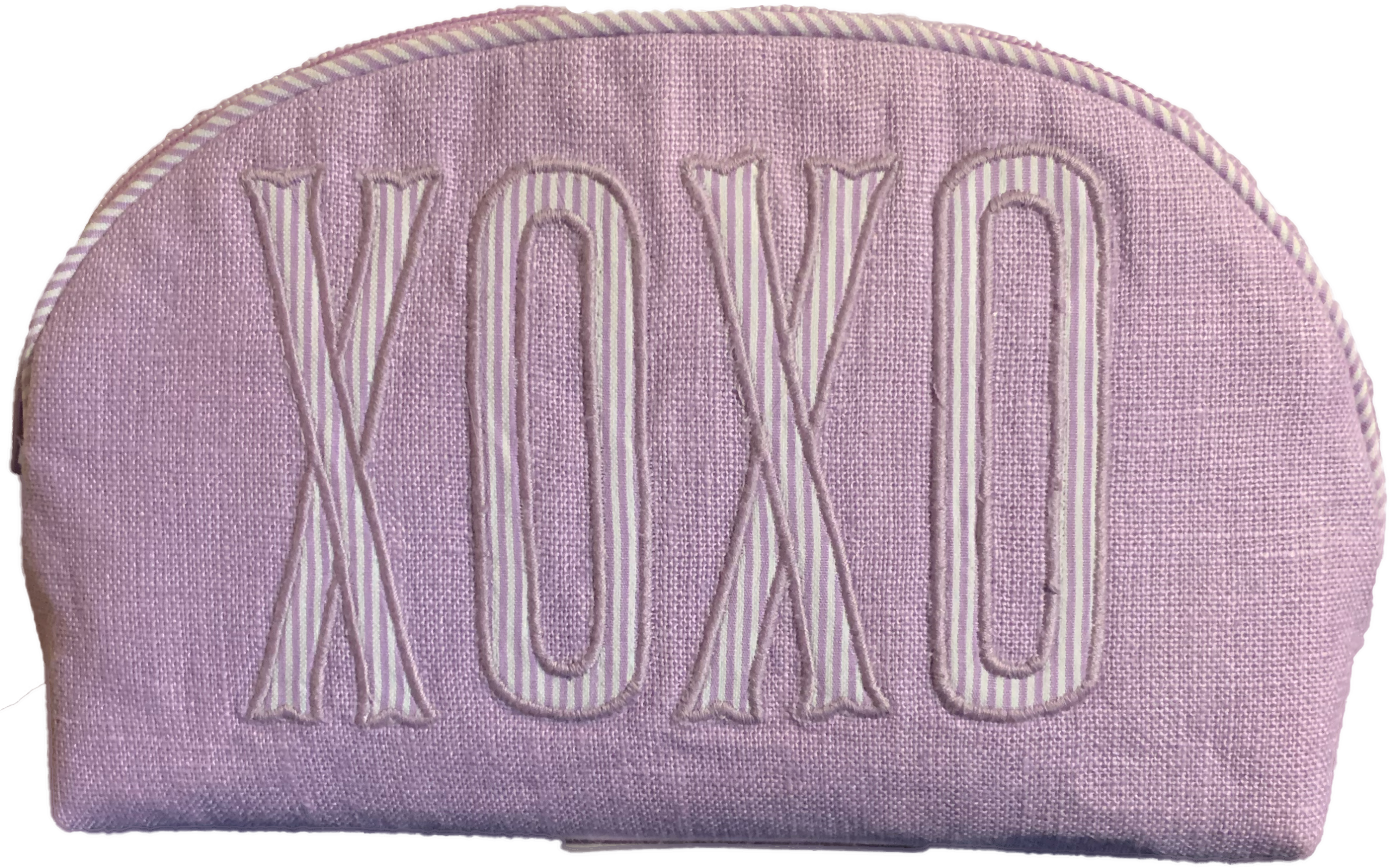Single zipper round pouch. Lavender smooth linen with applique monogram in lavender & white stripe poplin.. 7” W x 4 1/2 H” x 3’’ D